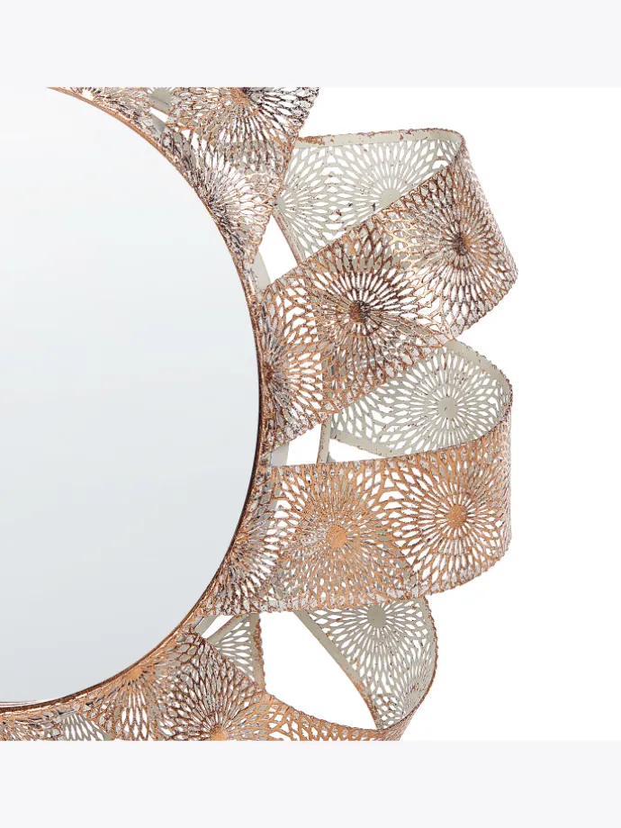 Wunderschöner Spiegel mit eleganter Ausstrahlung. Dieser schicke Wandspiegel mit gemustertem Rahmen ist eine perfekte Kombination von höchster Qualität und subtiler Eleganz. Gefertigt aus hochwertigem Glas und Metall, passt er ideal sowohl in romantische als auch in klassische Innenräume. Seine untypische Form erinnert an ein fließendes Schmuckband und lässt dieses Wohnaccessoire zum dekorativen Mittelpunkt des Raumes werden.