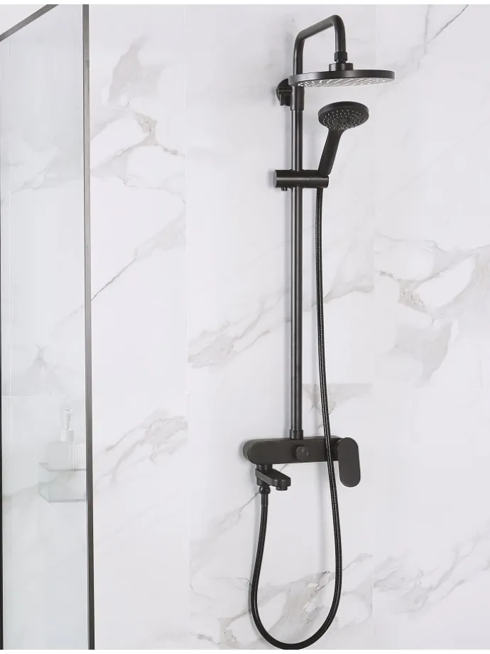Exklusives Duschset in einer eleganten schwarzen Optik. Dieses Regenduschset ist definitiv eine großartige Lösung für alle, die Wert auf Komfort legen. Die robuste Messingkonstruktion garantiert Langlebigkeit, während das klassische schwarze Finish nahtlos zu glamourösen und modernen Bädern passt. Die Handbrause und die Regenbrause sind aus Kunststoff gefertigt, wodurch sie leicht und dennoch langlebig sind. Die Wassertemperatur und der Wasserdruck lassen sich mit dem Einhebelmechanismus leicht einstellen.
