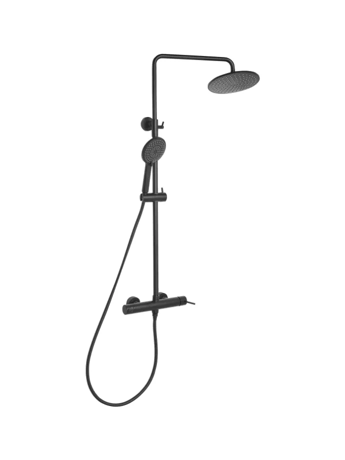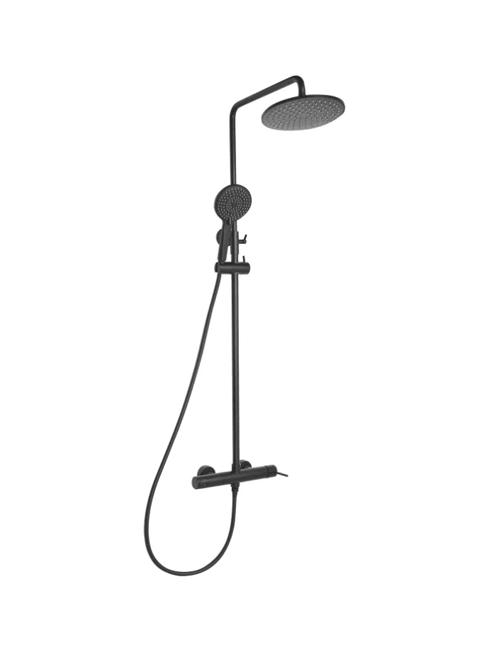 Höhenverstellbares Duschset mit Regendusche und Handbrause. Statten Sie Ihre Dusche mit einem Set aus, das Ihr Duscherlebnis mit seinen durchdachten Funktionen und seiner luxuriösen Optik steigert. Das Duschset besteht aus einer wandmontierten Gleitschiene, einer Einhebelmischbatterie, einer Handbrause mit Schlauch und einer Regendusche. Die Brause verfügt über 3 Strahlarten: Regenstrahl, Massagestrahl und gezielter Wasserstrahl. Sowohl der Winkel als auch die Höhe der Handbrause und Regendusche lassen sich bequem an Ihre Bedürfnisse anpassen. Dank der Mischbatterie können Sie den Wasserdruck und die Temperatur intuitiv und präzise steuern. Gefertigt aus langlebigen Materialien, ist dieses Duschsystem nicht nur funktional, sondern auch perfekt für jedes moderne Badezimmer geeignet.