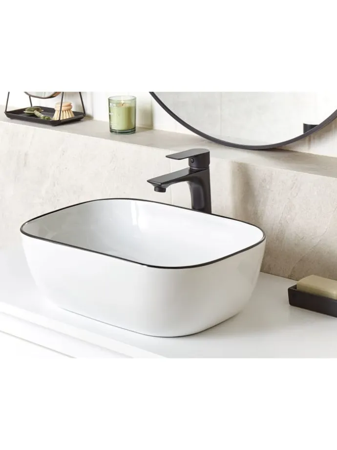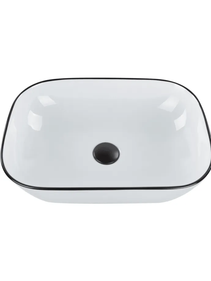 Ovales Waschbecken ohne Überlauf. Lassen Sie Eleganz in Ihrem Badezimmer einziehen und setzen Sie auf den klassischen schwarz-weißen Farbkontrast dieses Aufsatzwaschbeckens. Das Waschbecken besteht vollständig aus pflegeleichter, langlebiger Keramik und ist in einer wunderschönen Schalenform gehalten, die durch einen schwarzen Rand ergänzt wird. Perfekt für moderne und traditionelle Einrichtungen.