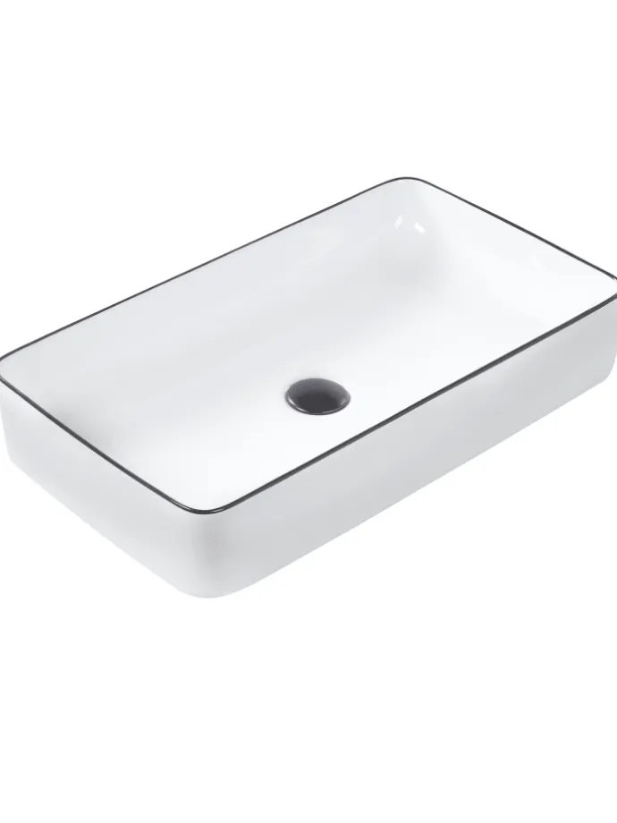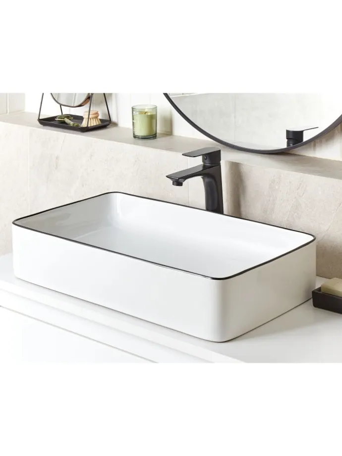 Rechteckiges Waschbecken ohne Überlauf. Lassen Sie Eleganz in Ihrem Badezimmer einziehen und setzen Sie auf den klassischen schwarz-weissen Farbkontrast dieses Aufsatzwaschbeckens. Das Waschbecken besteht vollständig aus pflegeleichter, langlebiger Keramik und ist in einer wunderschönen Schalenform gehalten, die durch einen schwarzen Rand ergänzt wird. Perfekt für moderne und traditionelle Einrichtungen.