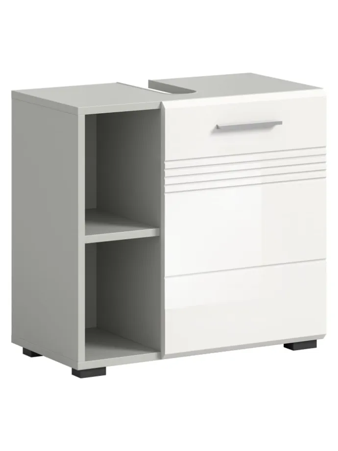 Entdecken Sie unseren hochwertigen Waschbeckenunterschrank in edlem Hellgrau Nachbildung und weißem Hochglanz, tiefgezogen für ein glänzendes Finish. Mit den Maßen (B/H/T: 60x56x32 cm) bietet er nicht nur praktischen Stauraum, sondern verleiht Ihrem Badezimmer auch eine moderne Note. Dieser Schrank ist die perfekte Wahl, um Funktionalität und Stil in Ihrem Bad zu vereinen.