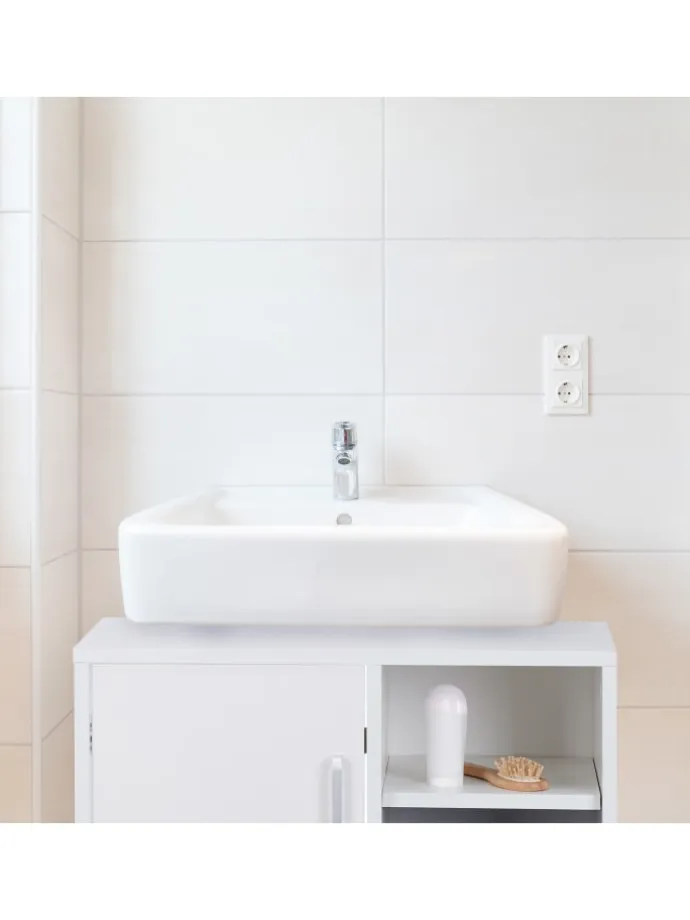 Sie suchen einen schicken Unterschrank für Ihr Bad? Dieser eintürige Waschbeckenunterschrank ist ein verlässlicher Komplize, wenn Sie diverse Badutensilien elegant neugierigen Blicken im Badezimmer entziehen möchten. Die Siphon-Aussparung ermöglicht es Ihnen, den Badezimmerschrank unter gängigen Waschbecken zu platzieren.