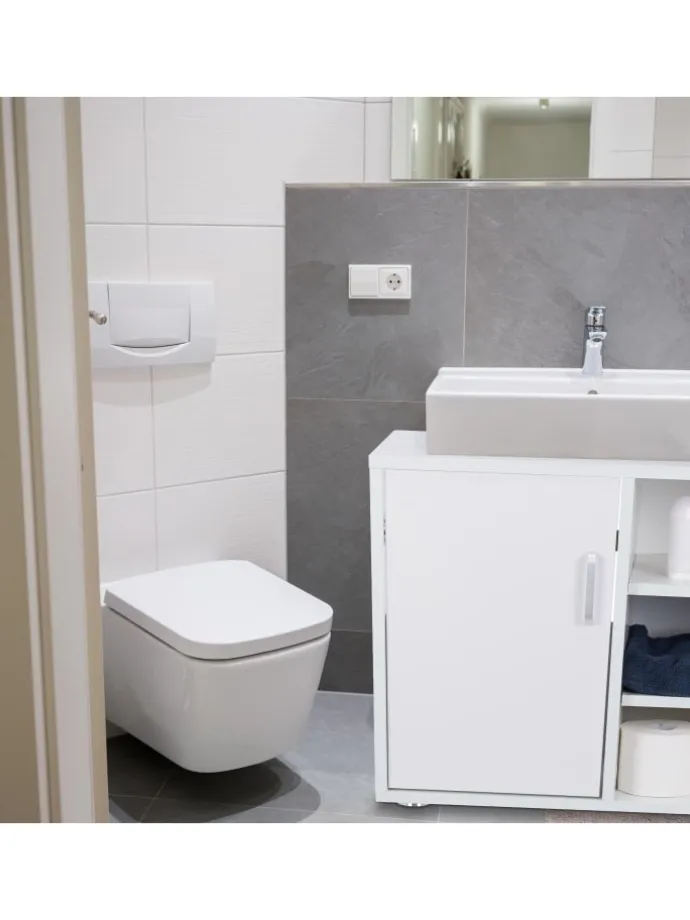 Neben dem großen Türfach verfügt der Unterstellschrank auch über 3 offene Ablagen. Diese sind ideal für Badutensilien, die griffbereit sein sollten wie Klopapier oder Handtücher.