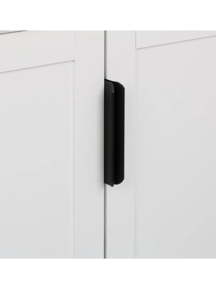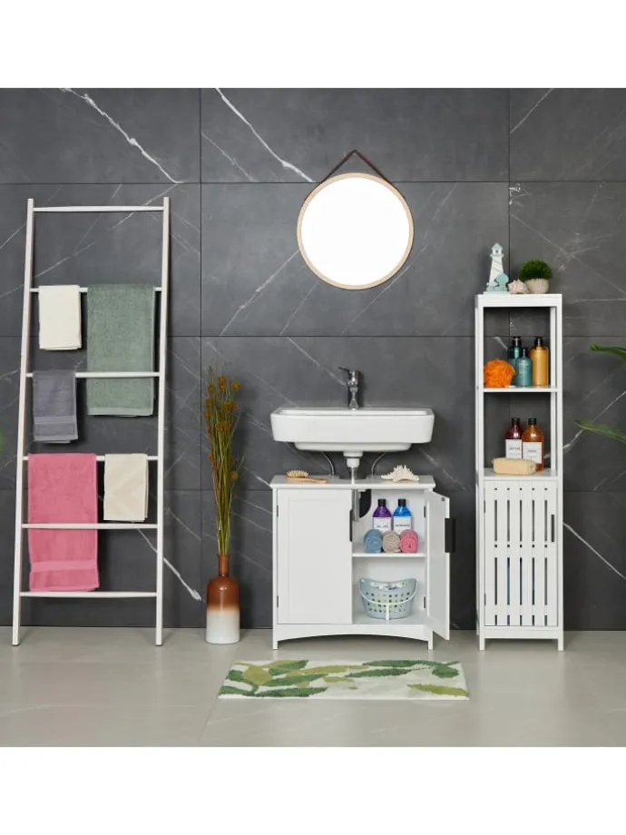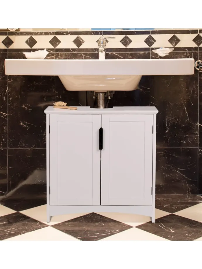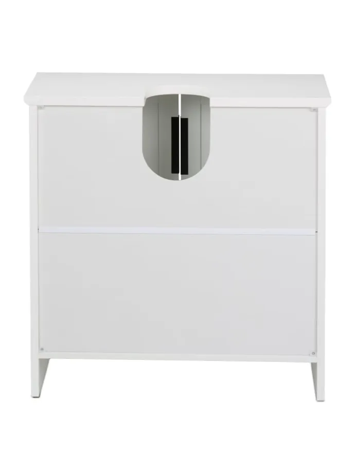 Mit diesem Badezimmerschrank nutzt Du den freien Platz unter dem Waschbecken sinnvoll aus. Vor allem in kleinen Bädern kannst Du so zusätzlichen, unverzichtbaren Stauraum schaffen. Der geräumige Innenraum des Badschranks bietet ausreichend Platz für Wasch- und Putzmittel, Toilettenpapier, Handtücher und andere Badutensilien. Das schlichte Design aus weißem MDF verleiht dem Unterbauschrank einen ansprechenden Look, der in jedem Badezimmer dekorative Akzente setzt.