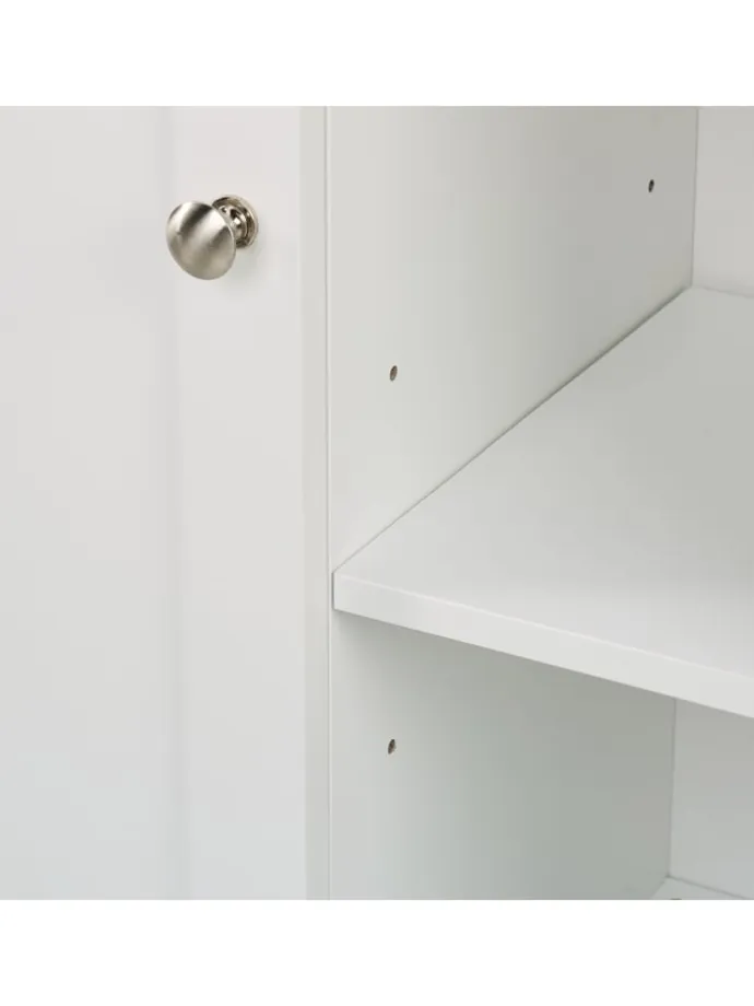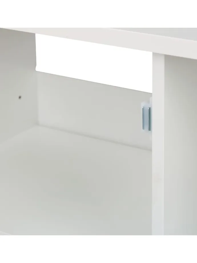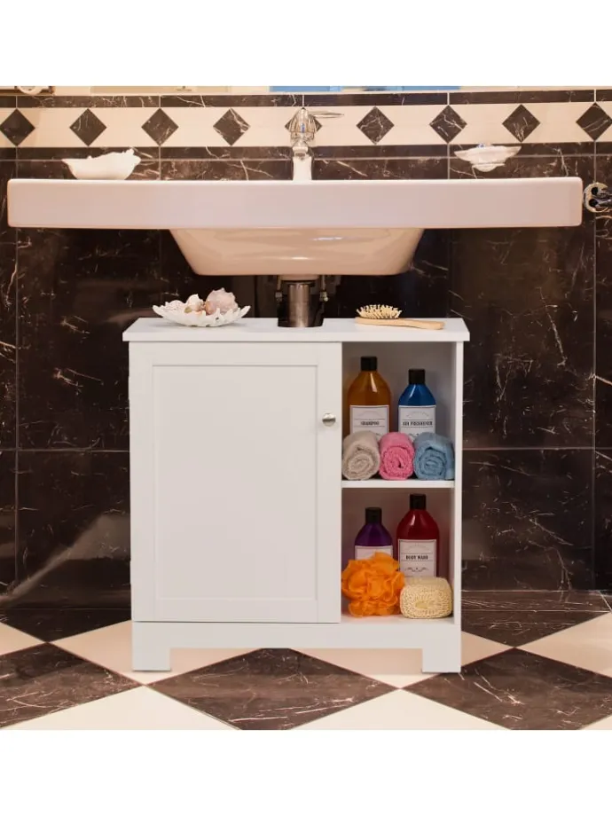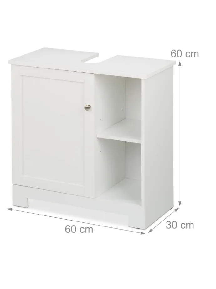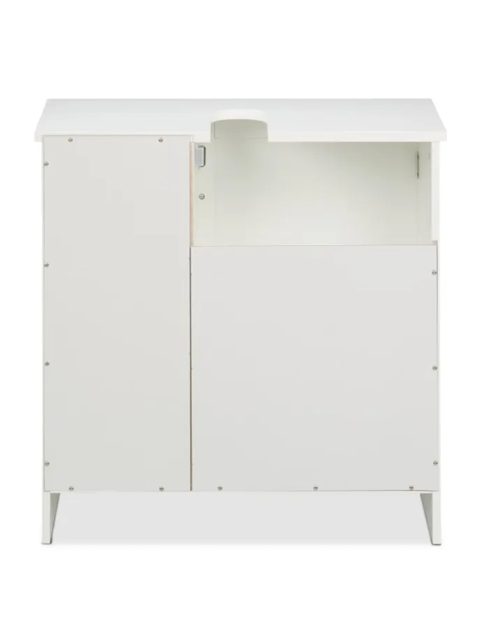 Mit dem Badezimmerschrank mit Tür nutzt Du den freien Platz unter dem Waschbecken sinnvoll aus. Vor allem in kleinen Bädern kannst Du so zusätzlichen, unverzichtbaren Stauraum schaffen. Zwei geschlossene und zwei offene Fächer mit flexibel einlegbarer Ablage bieten ausreichend Platz für Wasch- und Putzmittel, Toilettenpapier, Handtücher und andere Badutensilien. Das schlichte Design aus weißem MDF verleiht dem Unterbauschrank einen modernen Look, der in jedem Badezimmer dekorative Akzente setzt.