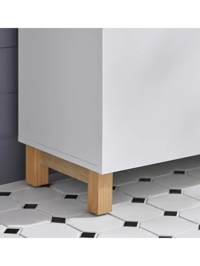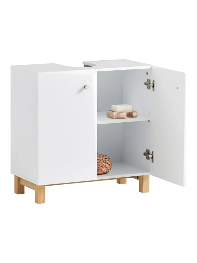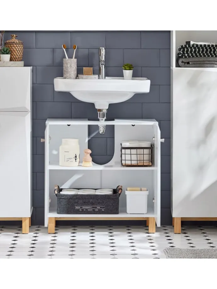 Der Schrank bietet, dank der Aussparung für den Siphon, die Möglichkeit, diesen unterhalb des Waschbeckens zu platzieren und somit den störenden Bauteilen zu verkleiden.
