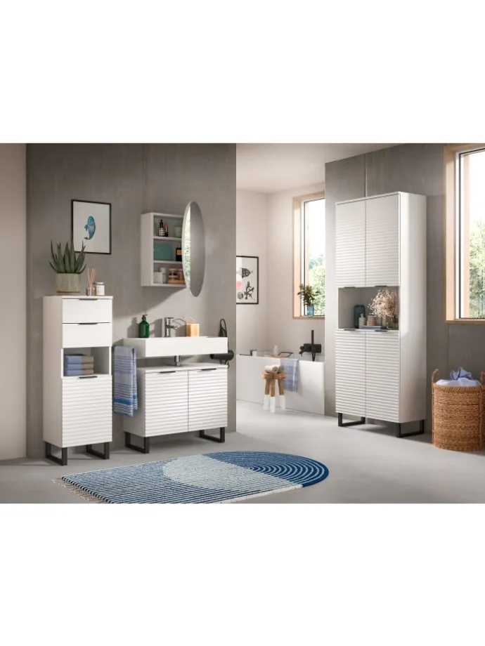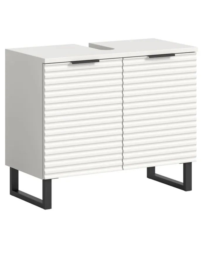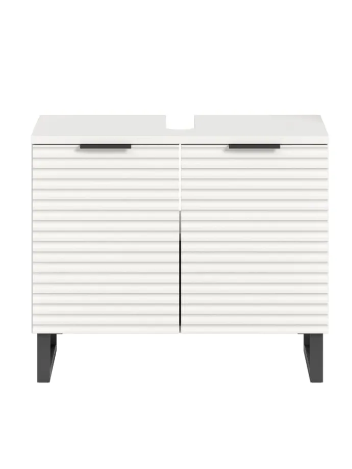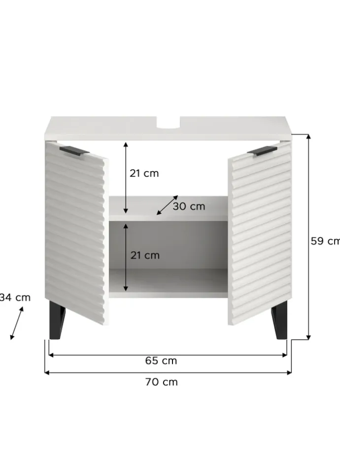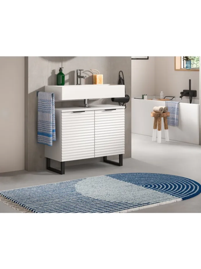 Dieser elegante Waschbeckenunterschrank in Weiß Nachbildung vereint modernes Design mit praktischer Funktionalität. Mit seinen Maßen von 70 cm Breite, 59 cm Höhe und 34 cm Tiefe bietet er viel Stauraum für Ihre Badezimmerutensilien und integriert sich nahtlos unter Ihr Waschbecken.Das besondere Highlight dieses Badmöbels ist die hochwertige Rillenoptik, die dem Unterschrank eine exklusive und edle Ausstrahlung verleiht. Die feinen Linien in Kombination mit der dezenten, matten weißen Oberfläche schaffen ein zeitloses Design, das zu jedem Badezimmerstil passt.Der stabile Kufenfuß sorgt nicht nur für einen sicheren Stand, sondern verleiht dem Waschbeckenunterschrank einen modernen, schwebenden Look. Diese optische Leichtigkeit macht den Schrank zu einem echten Hingucker in Ihrem Bad. Dieser stilvolle Waschbeckenunterschrank mit Rillenoptik und Kufenfuß ist die perfekte Lösung, wenn Sie Funktionalität und modernes Design in Ihrem Badezimmer kombinieren möchten.