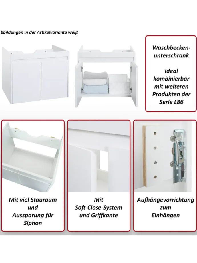Der Waschbeckenunterschrank ist ein praktisches Möbelstück für Ihr Badezimmer. Er lässt sich ideal mit anderen Produkten der Serie L86 kombinieren, um ein einheitliches Erscheinungsbild zu schaffen. Mit diesem Unterschrank erhalten Sie viel Stauraum, um Ihre Badutensilien ordentlich zu verstauen. Er verfügt über zwei Türen, die sich sanft mit dem Soft-Close-System schließen lassen. Die Griffkante ermöglicht eine bequeme Bedienung. Ein weiteres praktisches Merkmal des Unterschranks ist die Aussparung für den Siphon. Dadurch wird gewährleistet, dass das Waschbecken problemlos installiert werden kann, ohne auf den Stauraum verzichten zu müssen.
