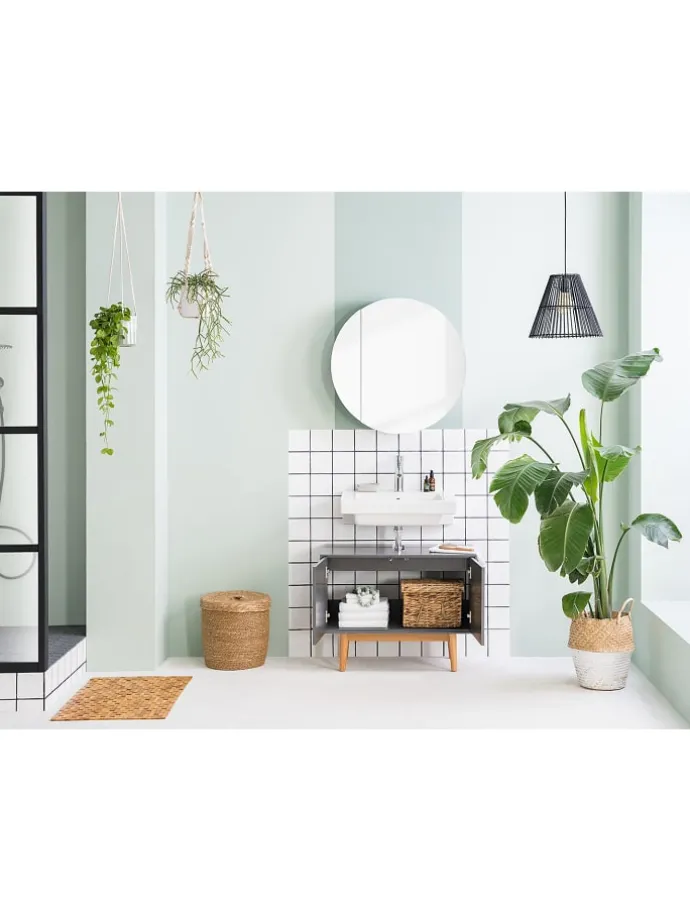 Dieser moderne Waschbeckenunterschrank in frischem Mint bietet durch seine robuste MDF-Konstruktion eine geordnete und langlebige Stauraumlösung für Ihr Badezimmer. Das Gestell aus massiver Eiche sorgt für maximale Standfestigkeit, während die lackierten Oberflächen das Möbelstück nachhaltig vor Feuchtigkeit schützen. Dank des integrierten Siphonausschnitts lässt er sich passgenau unter gängigen Waschbecken platzieren und schafft wertvollen Platz für Badutensilien. Ein funktionales Badmöbel, das Farbakzente und natürliche Wertigkeit ideal kombiniert.