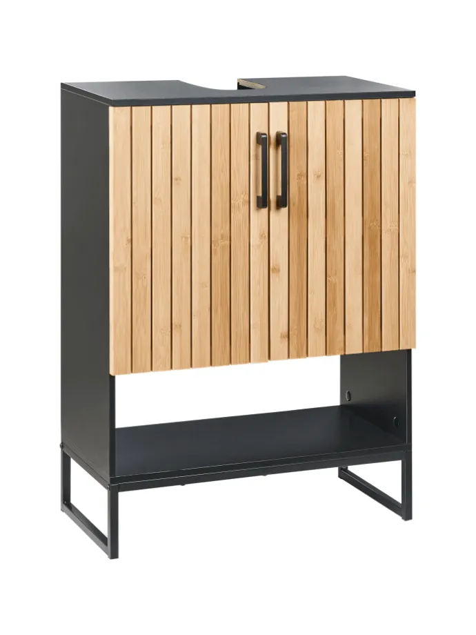 Geräumiger Badezimmerschrank aus Holz mit Ablageflächen. Dieser Waschbeckenunterschrank ist eine praktische Aufbewahrungslösung, mit der Sie Ihr Badezimmer ordentlich halten können. Er verfügt über zwei Türen mit Magnetverschluss, hinter denen sich zwei Regalböden für Toilettenartikel und Accessoires befinden. Ein zusätzlicher offener Unterschrank erhöht die Funktionalität und ermöglicht einen schnellen Zugriff auf wichtige Badezimmerutensilien. Die Kombination aus Bambusfronten, lackiertem Stahl und MDF gewährleistet eine langlebige und stabile Konstruktion mit moderner Optik.