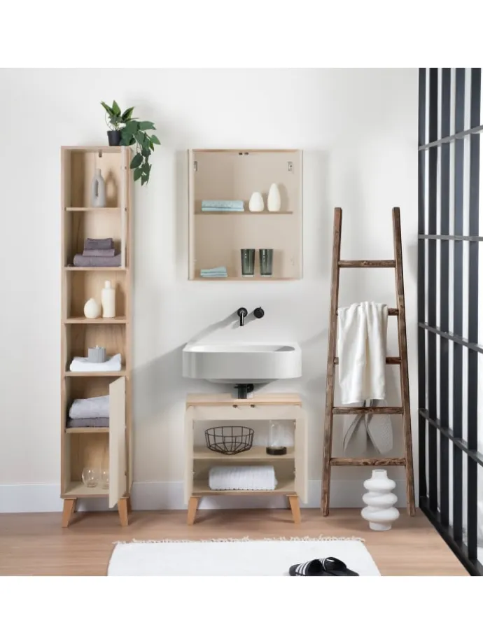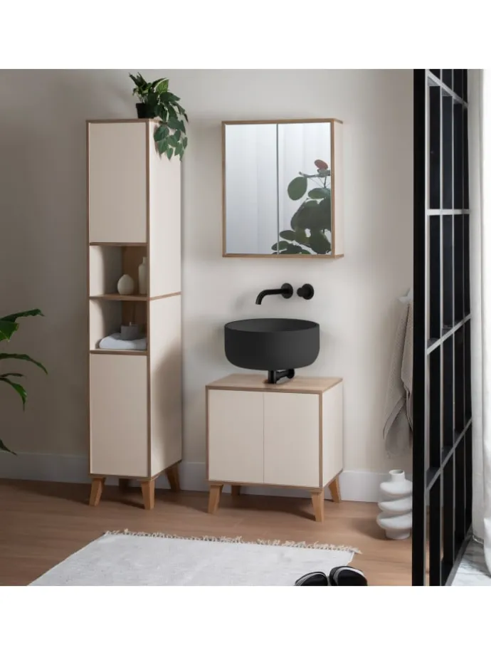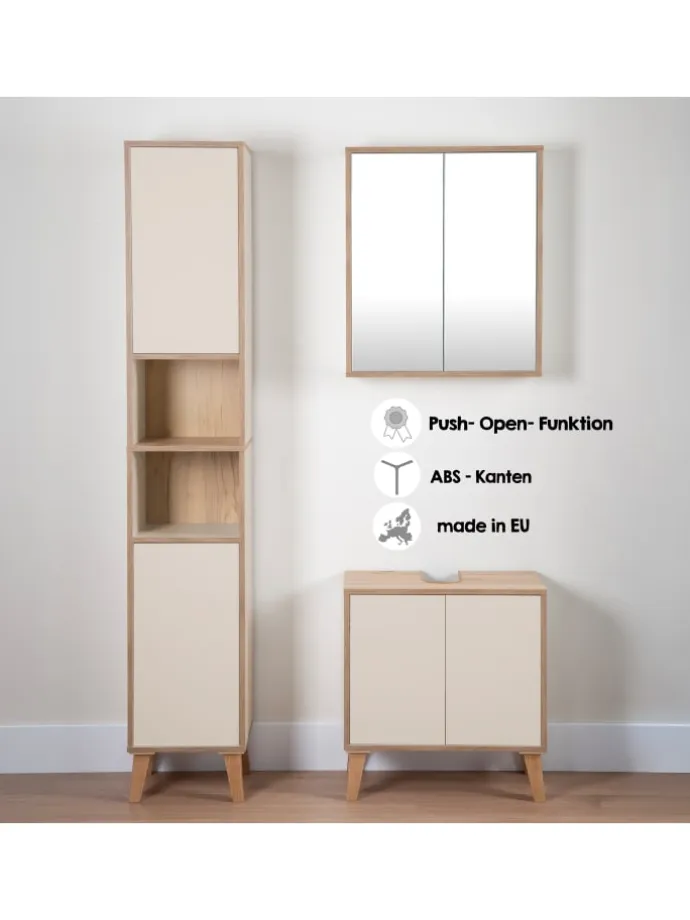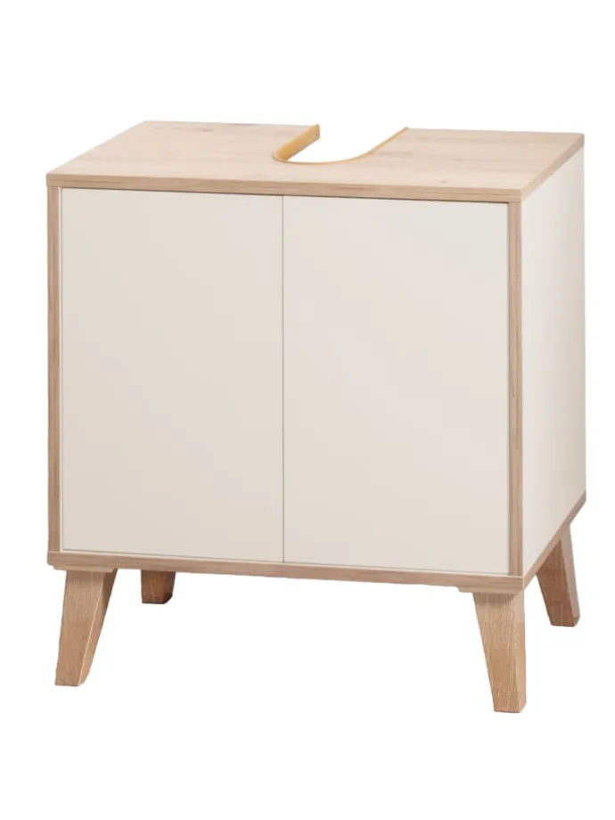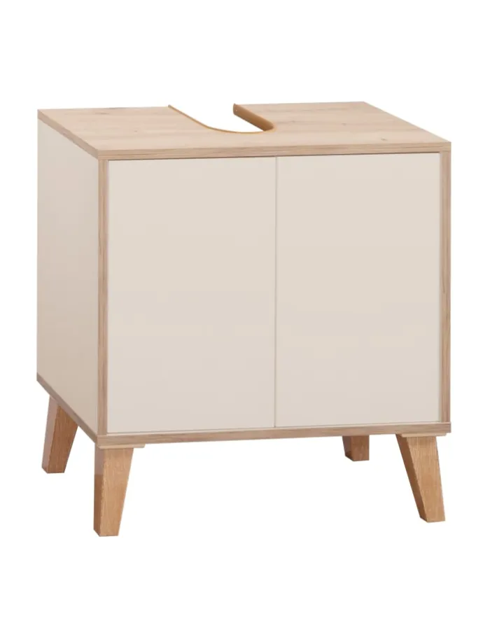 Entdecken Sie den Waschbeckenunterschrank MORENA in einem stilvollen cashmere/Artisan Eiche, der nicht nur ein echter Hingucker in Ihrem Badezimmer ist, sondern auch jede Menge praktischen Stauraum bietet. Diese Badserie kombiniert zeitloses Design mit moderner Funktionalität und verleiht Ihrem Bad eine harmonische Atmosphäre. Hergestellt in Europa aus hochwertigerSpanplatte mit robusten ABS-Kanten, garantiert dieser Schrank Langlebigkeit und sorgt für eine einfache Pflege. Die Kombination aus Artisan Eiche und einer eleganten weißen Oberfläche passt perfekt zu jedem Bad – egal ob klassisch oder modern. Die Füße aus foliertem Massivholz sorgen nicht nur für eine stabile Basis, sondern auch für einen wohnlichen Charakter. Ein echtes Highlight sind die Push-Open-Türen, die Ihnen das grifflos Öffnen ermöglichen und somit für ein aufgeräumtes Gesamtbild sorgen. Mit seinen zwei Türen und dem durchdachten Push-Open-Mechanismus bietet der Waschbeckenunterschrank ausreichend Platz für all Ihre Badutensilien, die Sie elegant verstauen möchten. Zudem sorgt der integrierte Siphonausschnitt dafür, dass der Raum unter Ihrem Waschbecken optimal genutzt wird. Die kompakten Maße von 60x63x32,5 cm machen ihn zu einer idealen Wahl für jedes Badezimmer. Statten Sie Ihr Bad mit diesem durchdachten und stylischen Möbelstück aus, das nicht nur funktional, sondern auch optisch überzeugend ist.