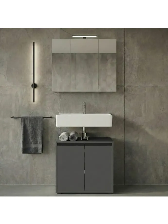 Verleihen Sie Ihrem Badezimmer mit diesem Waschbeckenunterschrank aus dem Hause Kadima Design eine Note von zeitloser Eleganz. Ob in modernem Steingrau oder markantem Graphit – dieses Möbelstück verkörpert die Philosophie unserer Marke: Ästhetik trifft auf Funktionalität. Die klaren Konturen, kombiniert mit schwarzen Griffleisten aus pulverbeschichtetem Metall, machen diesen Schrank zum Herzstück Ihres Bades. Dank der hochwertigen Melaminharzbeschichtung profitieren Sie von einer Oberfläche, die nicht nur edel aussieht, sondern auch den täglichen Anforderungen mühelos standhält.