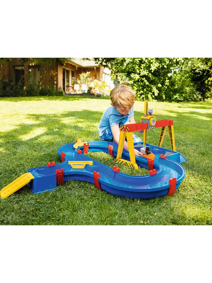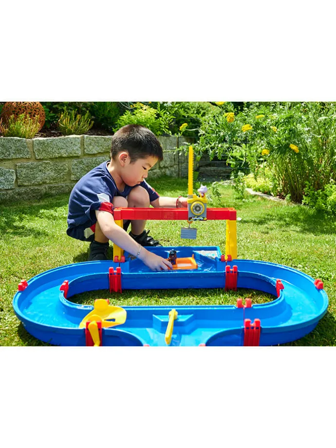 – Inhalt: Systemwasserbahn mit Hafenbecken sowie Auffahrtsrampe, Portalkran, Handkurbel zur Strömungserzeugung, Containerboot mit Container, Amphibienfahrzeug, 2 Spielfiguren