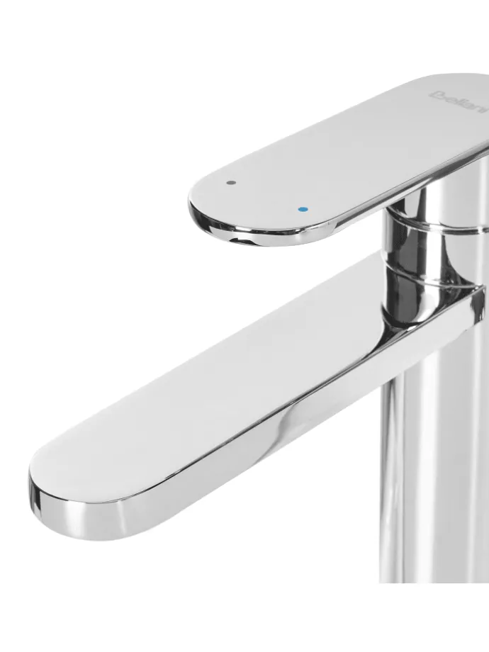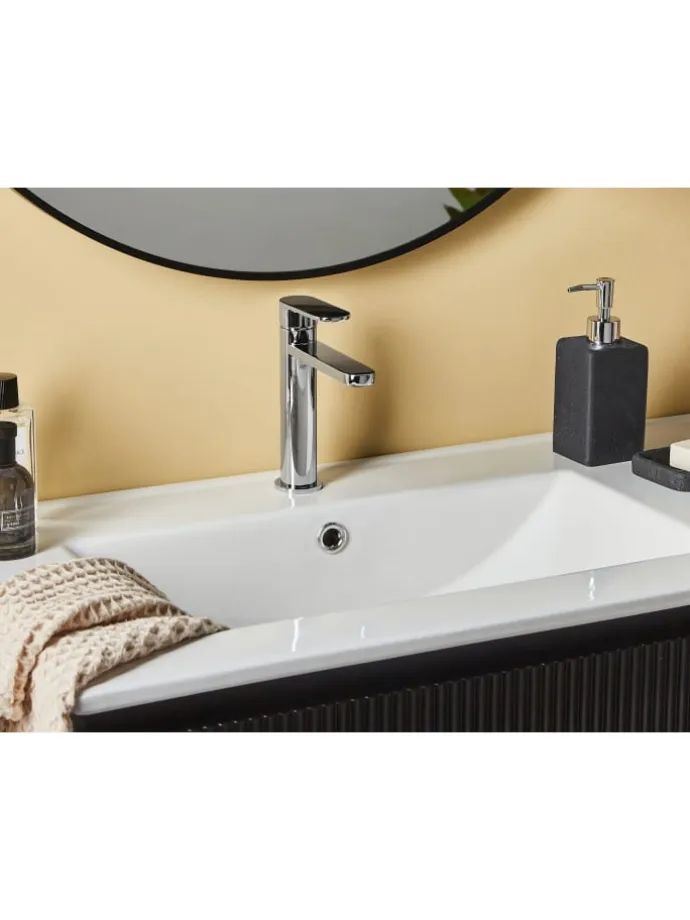 Verchromter Einhebel-Wasserhahn. Diese elegante Waschbeckenarmatur ist eine funktionale Ergänzung für Ihr Badezimmer. Sie ist aus Messing gefertigt und verfügt über eine klassische, verchromte Oberfläche in Silber, die sich vielseitig kombinieren lässt. Der Einhebelgriff ermöglicht eine komfortable und einfache Regulierung von Wassertemperatur und -fluss, während der gerade Auslauf für eine elegante Optik sorgt.