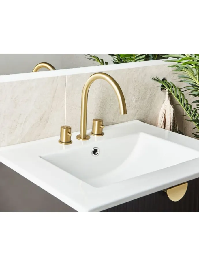 Wasserhahn mit zwei Griffen. Ergänzen Sie den Look Ihres Badezimmers mit einer stilvollen Waschbeckenarmatur. Gefertigt aus pflegeleichtem und langlebigem Messing mit matter Oberfläche, verfügt der Wasserhahn über zwei Griffe zur komfortablen Regulierung von Wassertemperatur und -fluss. Der lange, geschwungene Auslauf verleiht Ihrem Bad Eleganz und sorgt für eine angenehme Nutzung.