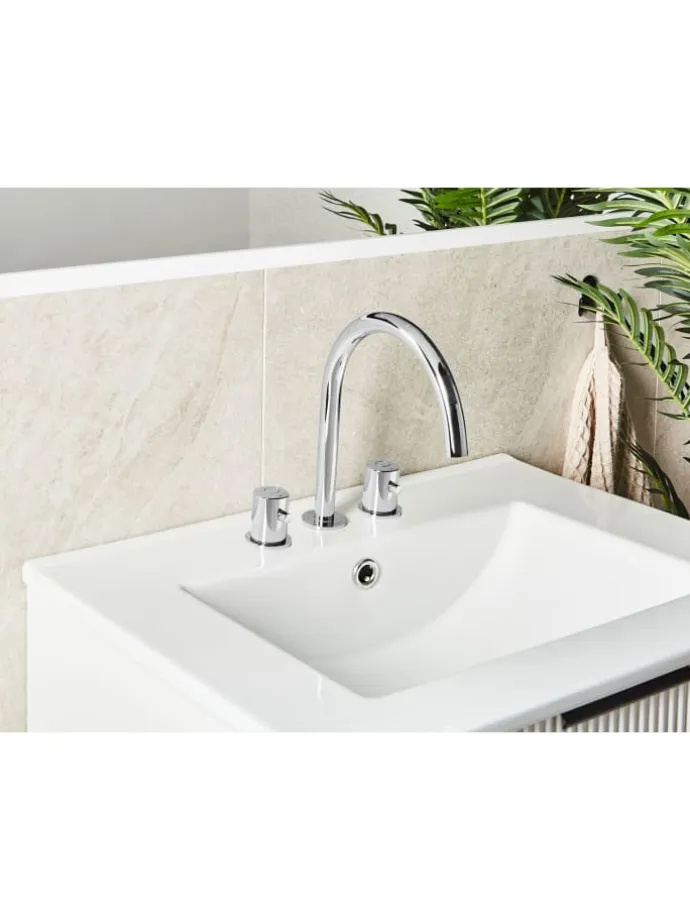 Wasserhahn mit zwei Griffen. Ergänzen Sie den Look Ihres Badezimmers mit einer stilvollen Waschbeckenarmatur. Gefertigt aus pflegeleichtem und langlebigem Messing mit verchromter Oberfläche, verfügt der Wasserhahn über zwei Griffe zur komfortablen Regulierung von Wassertemperatur und -fluss. Der lange, geschwungene Auslauf verleiht Ihrem Bad Eleganz und sorgt für eine angenehme Nutzung.