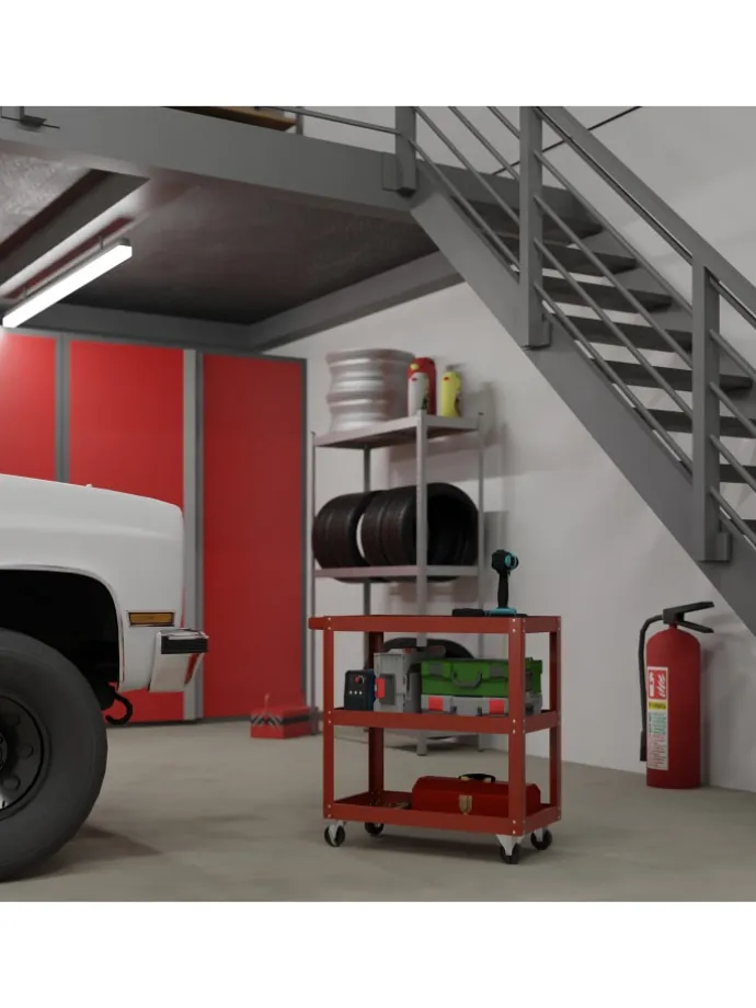 Bringe Ordnung in Deine Werkstatt und maximiere die Effizienz Deiner Projekte mit dem Werkzeugwagen, der durch Stabilität und Mobilität überzeugt. 3 große Ablagen schaffen ausreichend Stauraum um Werkzeug, Materialien und andere Lasten unterzubringen und zu transportieren. Dank der 360° drehbaren Räder und dem handlichen Griff lässt sich der Rollwagen einfach schieben und lenken. Gleichzeitig garantieren die Feststellbremsen des Materialwagens einen sicheren Stand beim Abstellen.