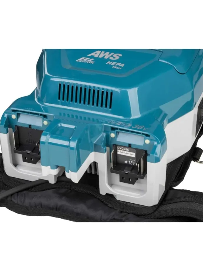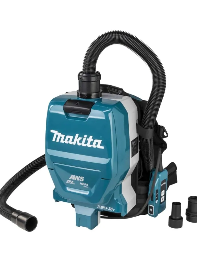 2x 18 V starker Rucksacksauger zur mobilen StaubabsaugungAkkus sind in Reihe geschaltet und weerden parallel in separate Akkuhalterungen eingeschobenAWS Auto-Start Wireless System – Staubsauger startet automatisch, wenn ein gekoppeltes Gerät in Betrieb genommen wirdAWS Bluetooth Funk Adapter 198900-7 im Lieferumfang enthaltenHEPA-FilterGepolsterte GurteLED-ArbeitslichtZweistufige SaugkrafteinstellungBis zu 75 Minuten Betriebszeit bei der Verwendung von 2x BL1860B, 18V / 6,0 Ah Akku (optional erhältlich)AkkuschutzsystemMemoryfunktion: Startet bei erneutem einschalten mit der zuletzt verwendeten SaugleistungTechnische Daten: