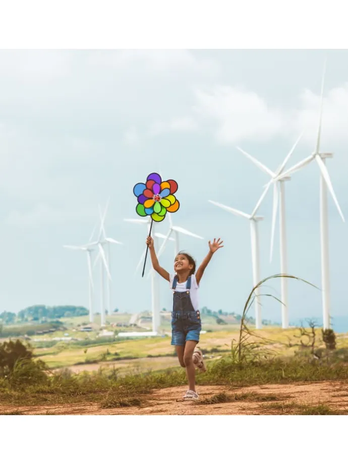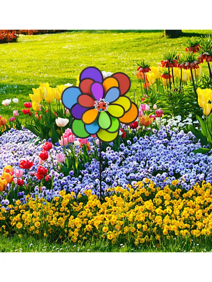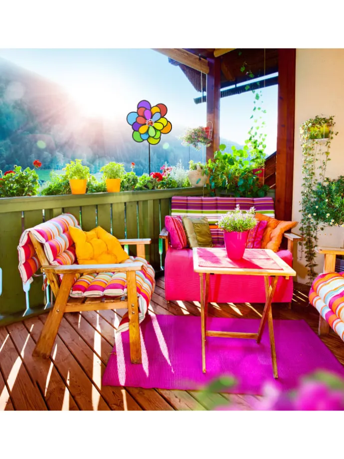 Dieser frühlingshafte Gartenstecker ist die ideale Dekoration, um karge Balkone, graue Terrassen oder einfältige Gärten freundlicher zu gestalten. Einfach ins Beet oder einen Blumentopf gesteckt, ist das regenbogenfarbene Blumen Design ein echter Hingucker. Genießen Sie das prachtvolle Farbenspiel, wenn das Windrad von wehenden Lüften angetrieben wird. An dem Windspiel können sich Kinder und Erwachsene gleichermaßen erfreuen. Nehmen Sie die Windmühle auch mit zum Camping oder an den Strand.