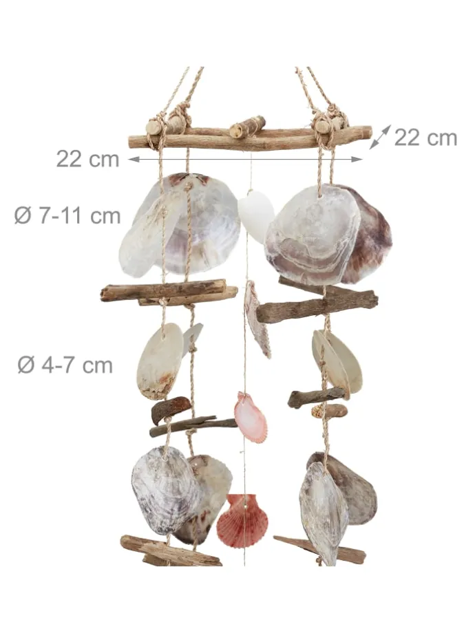 Neben den echten Capizmuscheln finden sich auch Jakobsmuscheln und Herzmuscheln an den Fäden. Durch den natürlichen Strand-Look wirkt das Muschel Windspiel besonders harmonisch und dekorativ.