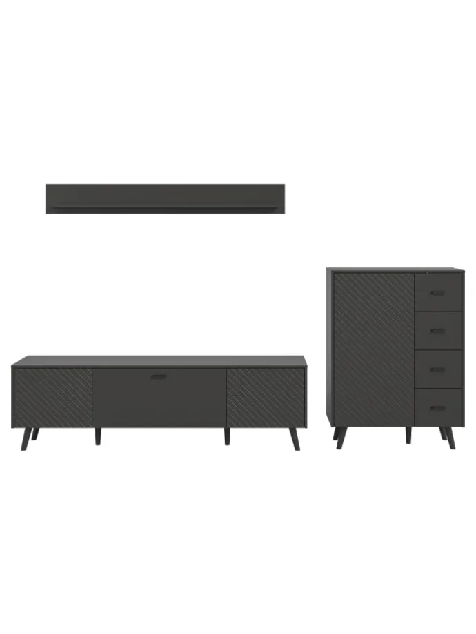 Gestalten Sie Ihren Wohnraum neu mit unserer 3-teiligen Wohnkombination! Diese besteht aus einem stilvollen Lowboard, einem praktischen Wandboard und einer eleganten Kommode, die ärgerfrei miteinander kombiniert werden können. Mit Abmessungen von 269 x 175 x 40 cm und einer hochwertigen MDF-Front mit eingefräster Karo-Optik bringt diese Kombination sowohl Funktionalität als auch Stil in Ihr Zuhause.