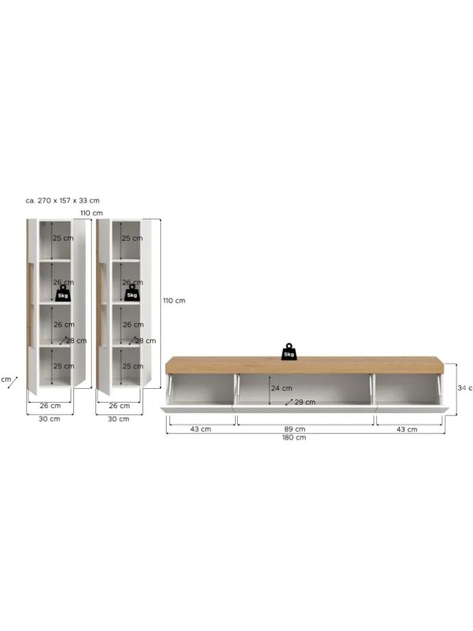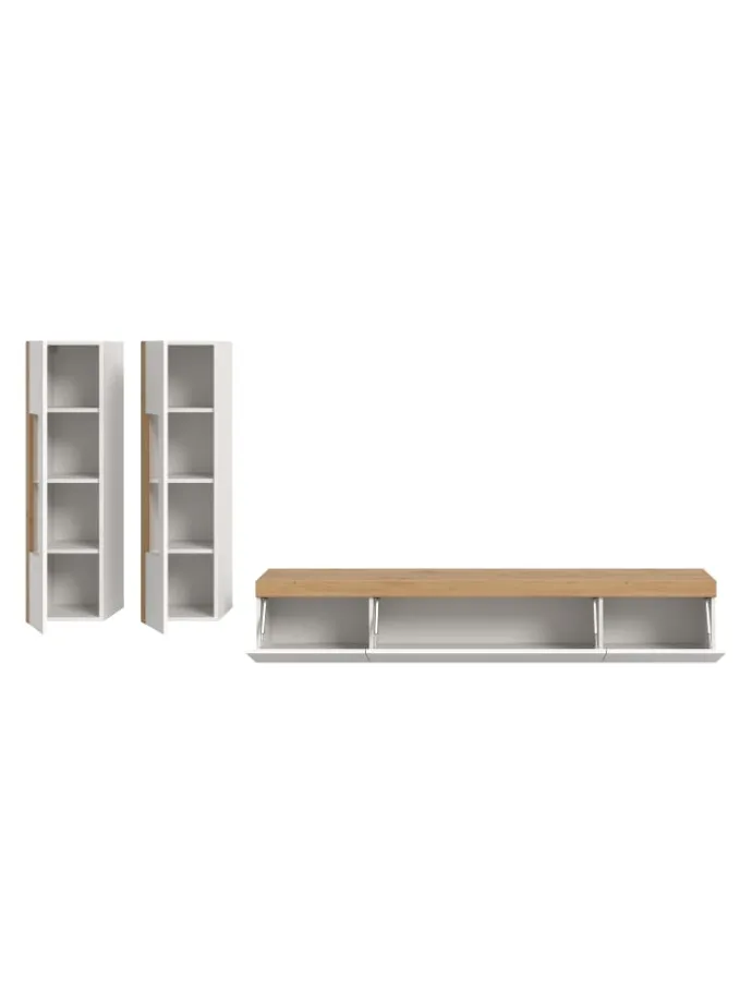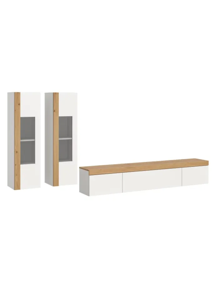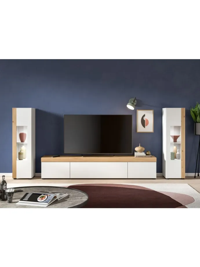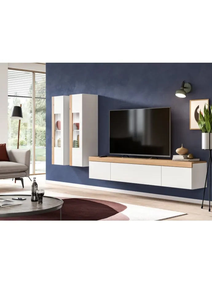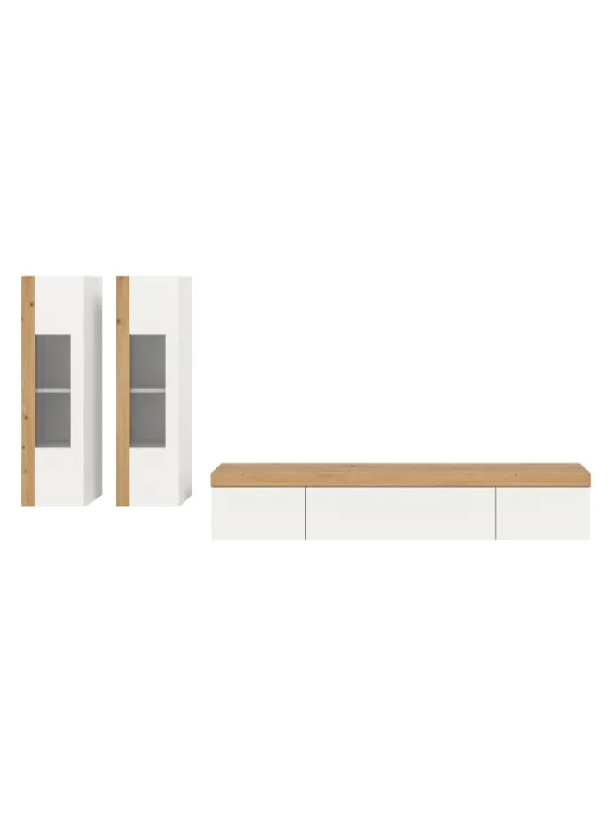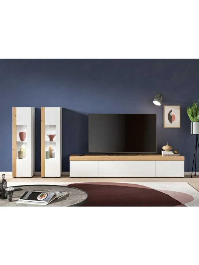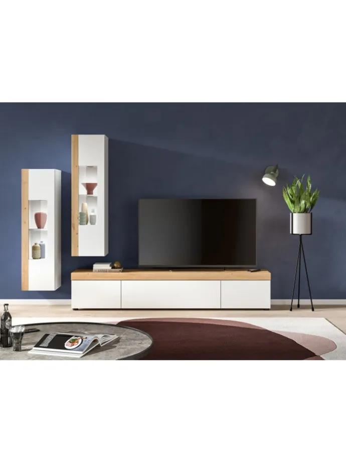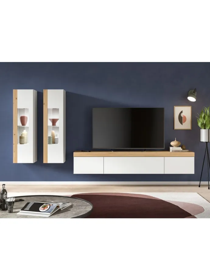 Erleben Sie die vielseitige 3-teilige Wohnkombination, die Eleganz und Funktionalität in einem bietet! Diese Kombination umfasst zwei Vitrinen und ein großzügiges Lowboard, das sowohl hängend als auch stehend montiert werden kann. Mit einem Typenabstand von 15 cm bietet die Wohnkombination optimale Nutzungsmöglichkeiten und passt perfekt in moderne Wohnräume. Perfekt für die stilvolle Aufbewahrung und Präsentation von Dekorationen und Multimedia-Geräten.