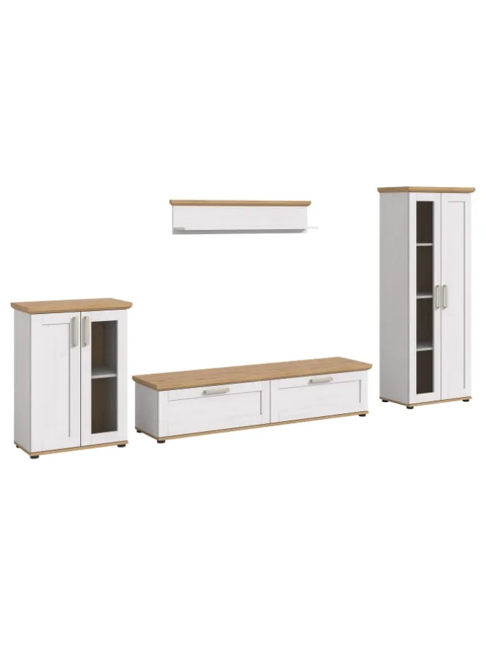 Vervollständigen Sie Ihr Wohnkonzept mit unserer 4-teiligen Wohnkombination! Diese umfasst zwei kleine Vitrinen, ein Lowboard und ein Wandboard. Ideal für stimmungsvolle Arrangements, vereint diese Kombination modernen Stil mit der gemütlichen Ausstrahlung des Landhaus-Looks. Die pflegeleichten Oberflächen sorgenv für Langlebigkeit und einfache Reinigung.
