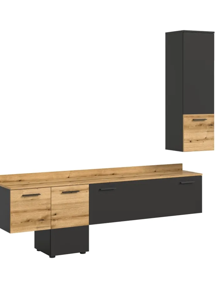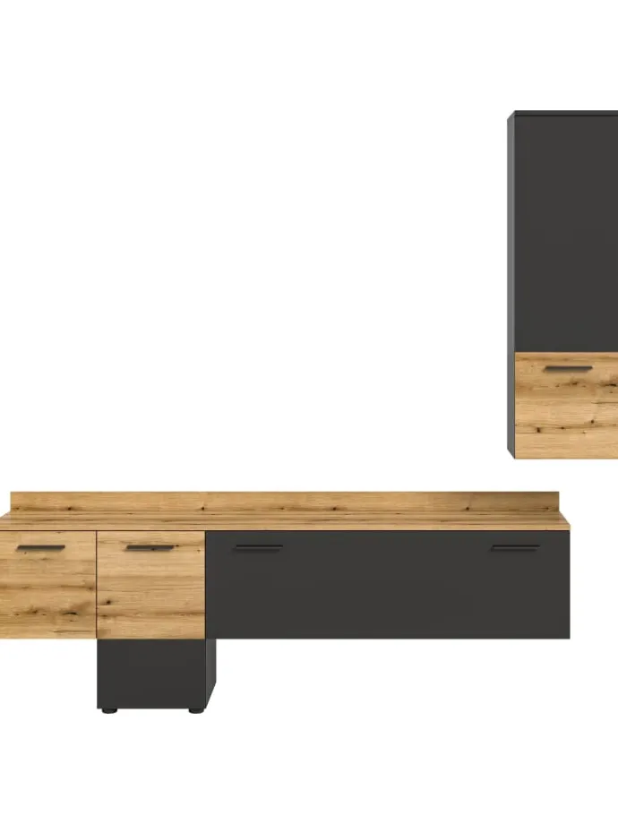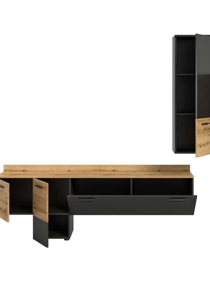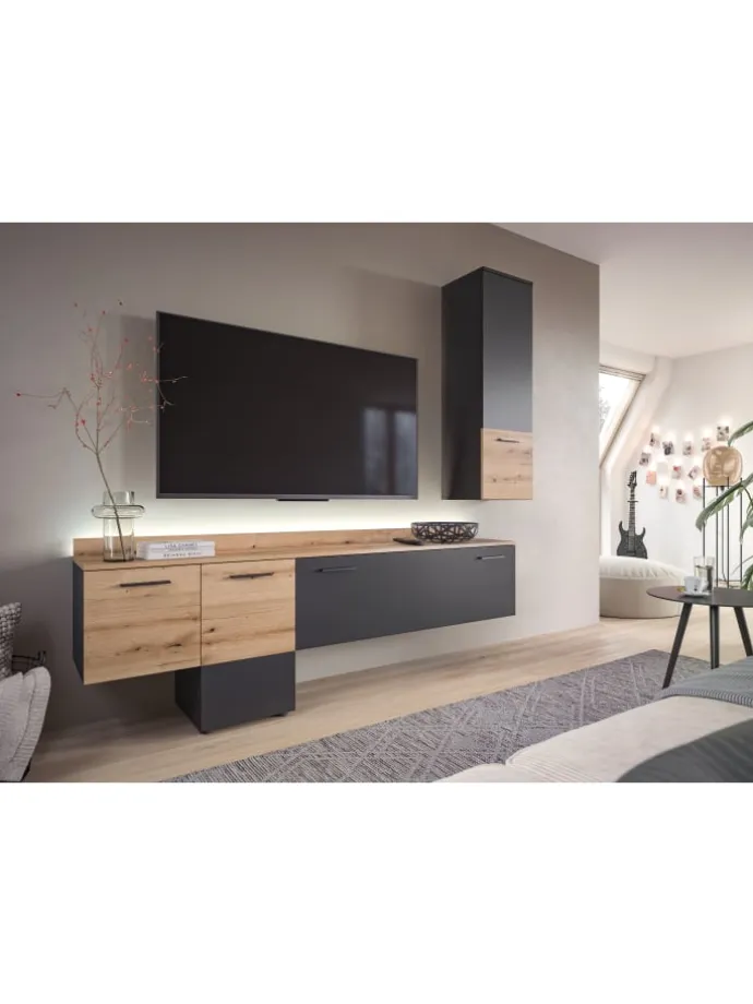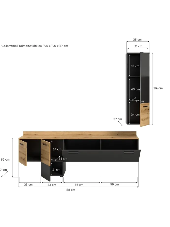 Unsere geräumige Wohnwand in stilvollem Grau-Nachbildung bietet eine perfekte Lösung für Ihr Wohnzimmer. Mit großzügigen Abmessungen von 195x196x37 cm schafft sie nicht nur ausreichend Stauraum, sondern setzt auch moderne Akzente in Ihrem Zuhause. Entdecken Sie jetzt die perfekte Kombination aus Funktionalität und zeitlosem Design für ein stilvolles Wohnambiente.