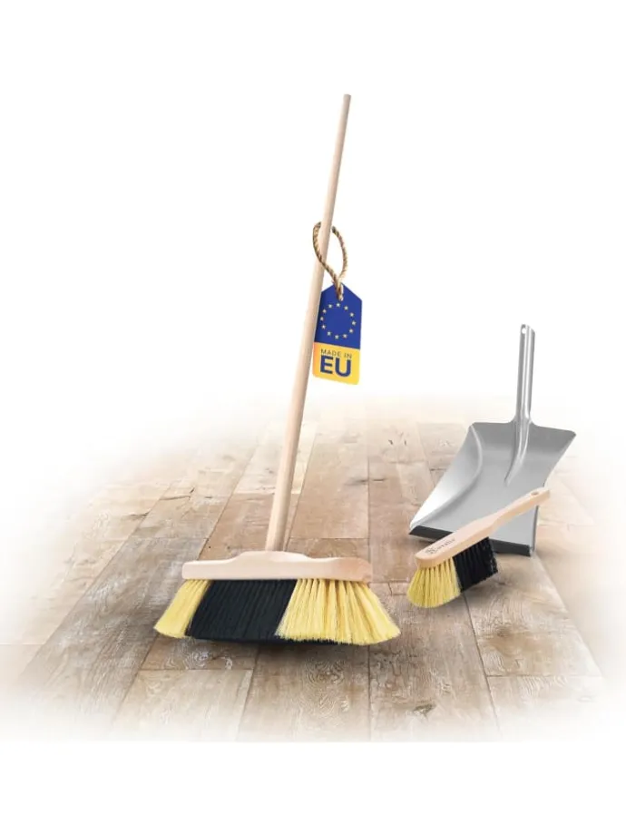 LIEFERUMFANG: Sie erhalten eine Kehrgarnitur (Feger und Kehrblech mit Gummilippe) mit Kunstborstenborsten sowie einen Zimmerbesen Kunstborsten mit Holzstiel