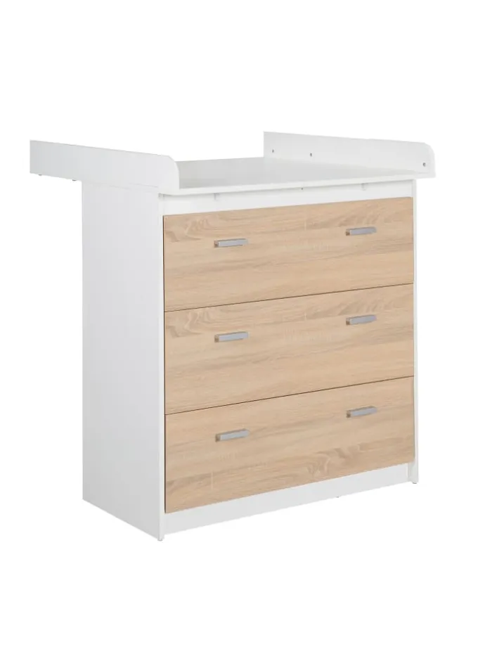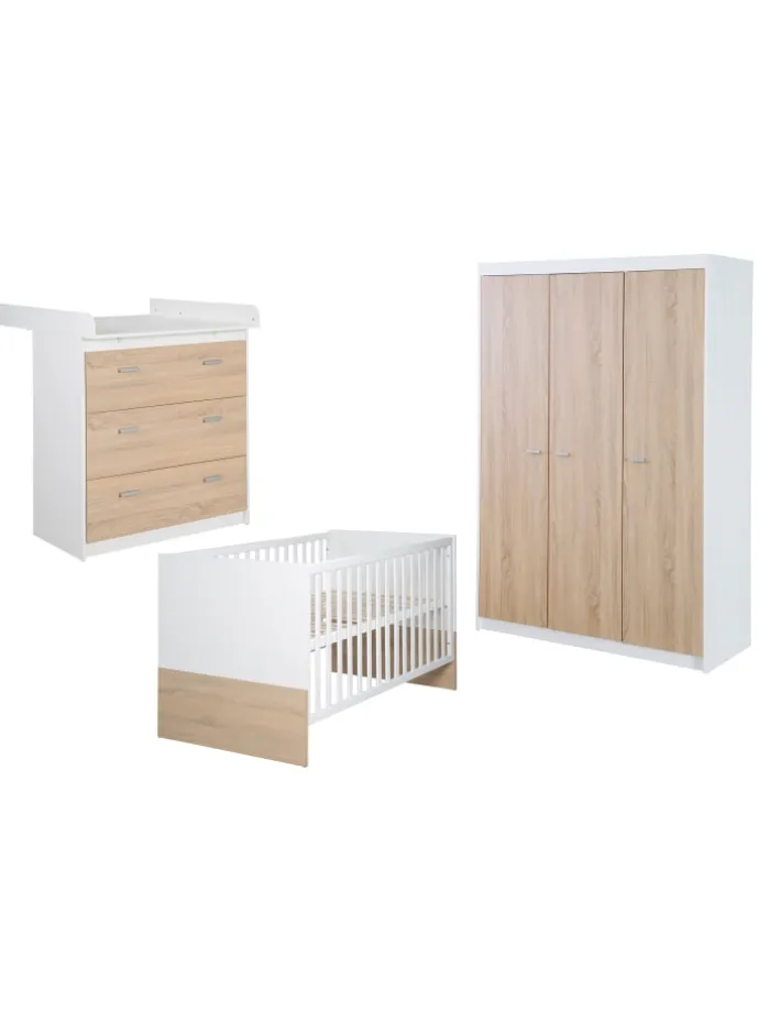 Das roba Kinderzimmerset ‚Gabriella‘, besteht aus Kombi-Kinderbett 70x140cm, Wickelkommode mit 3 Schubladen und Kleiderschrank 3-türig, Korpus & Fronten in bicolor, Eiche/Weiß. Das roba Babybett 70 x 140 cm lässt sich zum Juniorbett fürs Kinderzimmer umbauen. Die Wickelkommode mit abnehmbarem Wickelansatz und rückenschonender Wickelhöhe ist zur Kommode umbaubar. Mit 3 Schubladen sorgt der Wickeltisch für viel Stauraum im Baby-und Kinderzimmer. Das Aufbaumaß der Wickelkommode beträgt HxB: 98x88cm, Tiefe mit/ohne Wickelansatz: 75/39cm, Wickelhöhe: 90cm. Der 3-türige Kleiderschrank hat eine praktische Einteilung mit Kleiderstange und 6 Fachböden für alle Kinder- oder Babysachen. Die Masse des Baby- & Kinderkleiderschrankes sind HxBxT: 190,5x131x52cm. Das Kindermöbelprogramm ‚Gabriella‘ ist nach den aktuellsten Sicherheitsnormen in Deutschland entwickelt. Alle Materialien haben eine pflegeleichte und robuste Oberfläche mit Kunstharzbeschichtung. Alle verwendeten Rohstoffe sind schadstoffgeprüft und kommen aus nachhaltiger Forstwirtschaft.