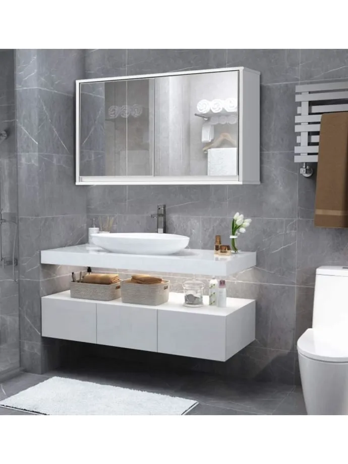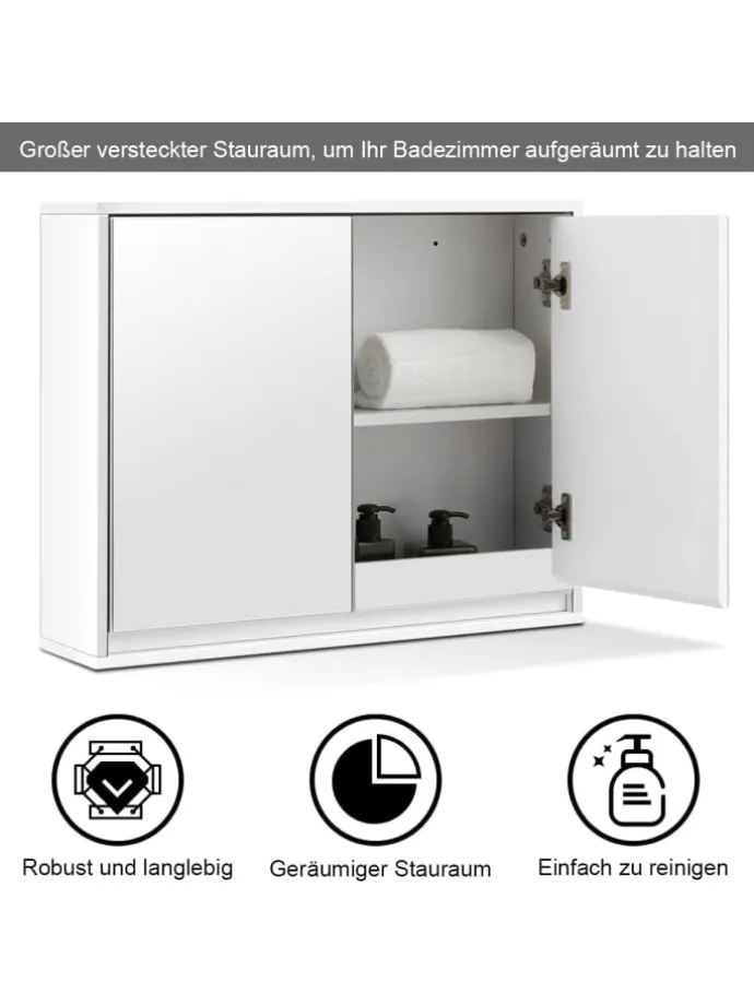 Aus MDF-Platten und hochwertigen UV-Platten gefertigt ist der Schrank robust und kann langfristig eingesetzt werden. Er bietet viel Platz für Kosmetika, Medizin und Hygieneartikel. Auch ist er durch seine verspiegelten Türen und das elegante Design eine dekorative Ergänzung für Ihre Einrichtung. Somit dient er sowohl als Schrank als auch als Spiegel.